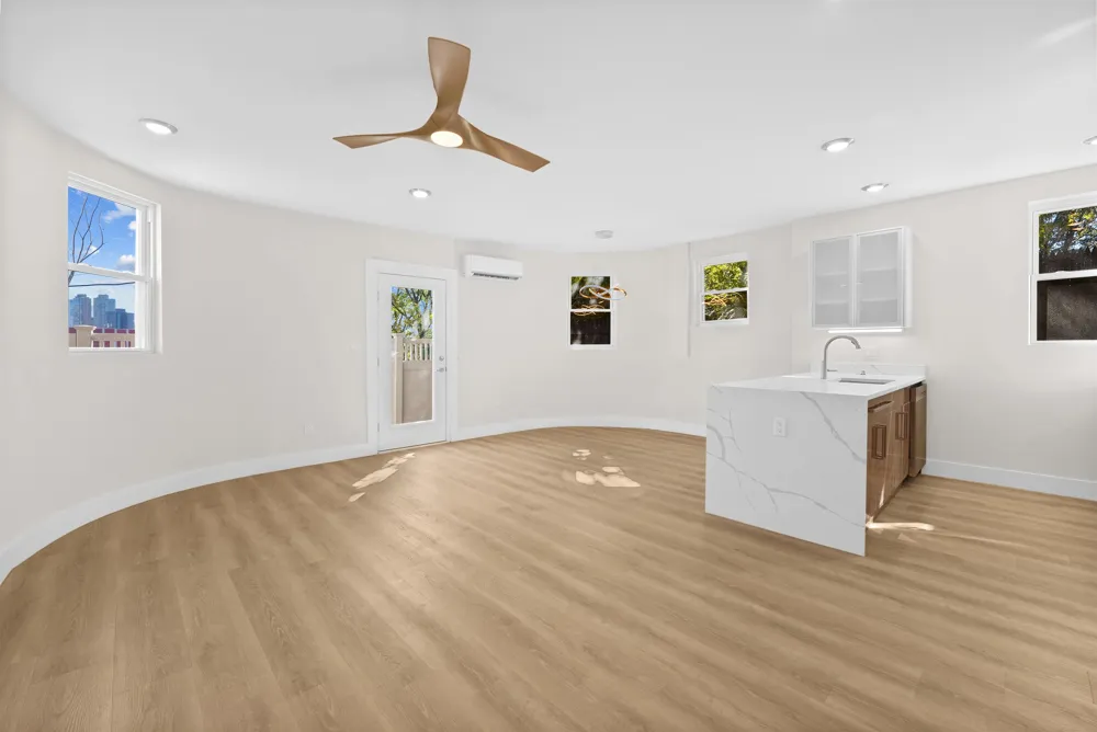 Discover sophisticated urban living in this stunning garden level condominium. This meticulously designed 2-bedroom, 1-bathroom residence offers an unparalleled blend of modern luxury and comfort. Step into a chef's dream kitchen, featuring top-of-the-line Samsung appliances, a breathtaking waterfall center island, and exquisite two-tone cabinetry adorned with under the counter lighting. Throughout the home, you'll find a consistent theme of refined style, crisp white accents and designer lighting. The open living, dining and kitchen area is washed with natural light from multiple East, Northeast and South facing windows, creating a bright and inviting ambiance. The primary bedroom is a true retreat. The second bedroom and den offer flexible use for today’s buyer. The bathroom features a modern lit and anti-fog mirror, adding both style and functionality. Venture outside to your private courtyard with partial NYC views, a rare retreat for relaxing, dining, and morning coffee. Enjoy ultimate comfort with energy efficient ductless heating and cooling. This is more than a home; it's a lifestyle. Affordable to purchase, economical to own, elegant layout, decidedly streamlined in flavor. The association owns the lot behind this building and provides walk-in storage and free washer and dryer conveniently located on this level. Don't miss the opportunity to experience the epitome of modern elegance at 102 Palisade Ave. in Jersey City’s newest, hip nabe, convenient to all within a few blocks: award winning schools, Downtown, parks and NYC transit.